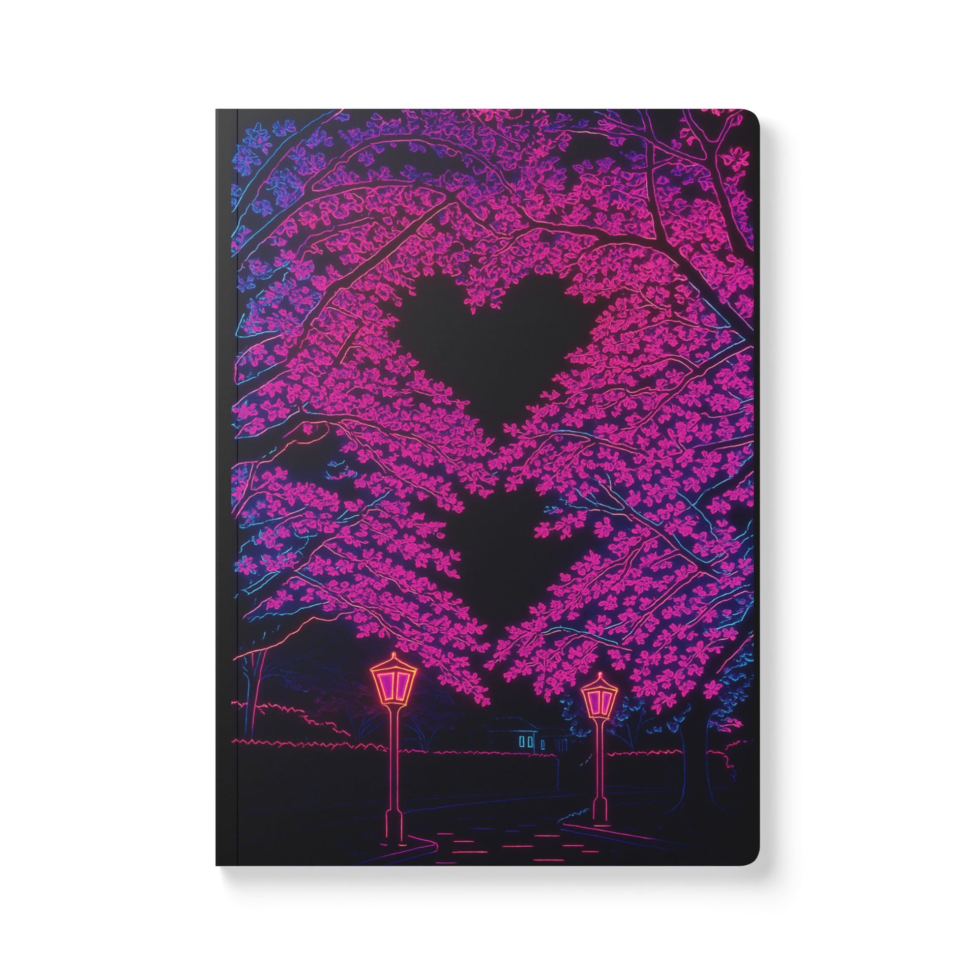 Step into a glowing dreamscape with this Neon Cherry Blossom Softcover Journal, where two radiant pink and purple trees form a heart in the night sky. Lit by vintage-style neon streetlamps, the design evokes peace, love, and inspiration—perfect for deep thoughts, tender moments, and everything in between.