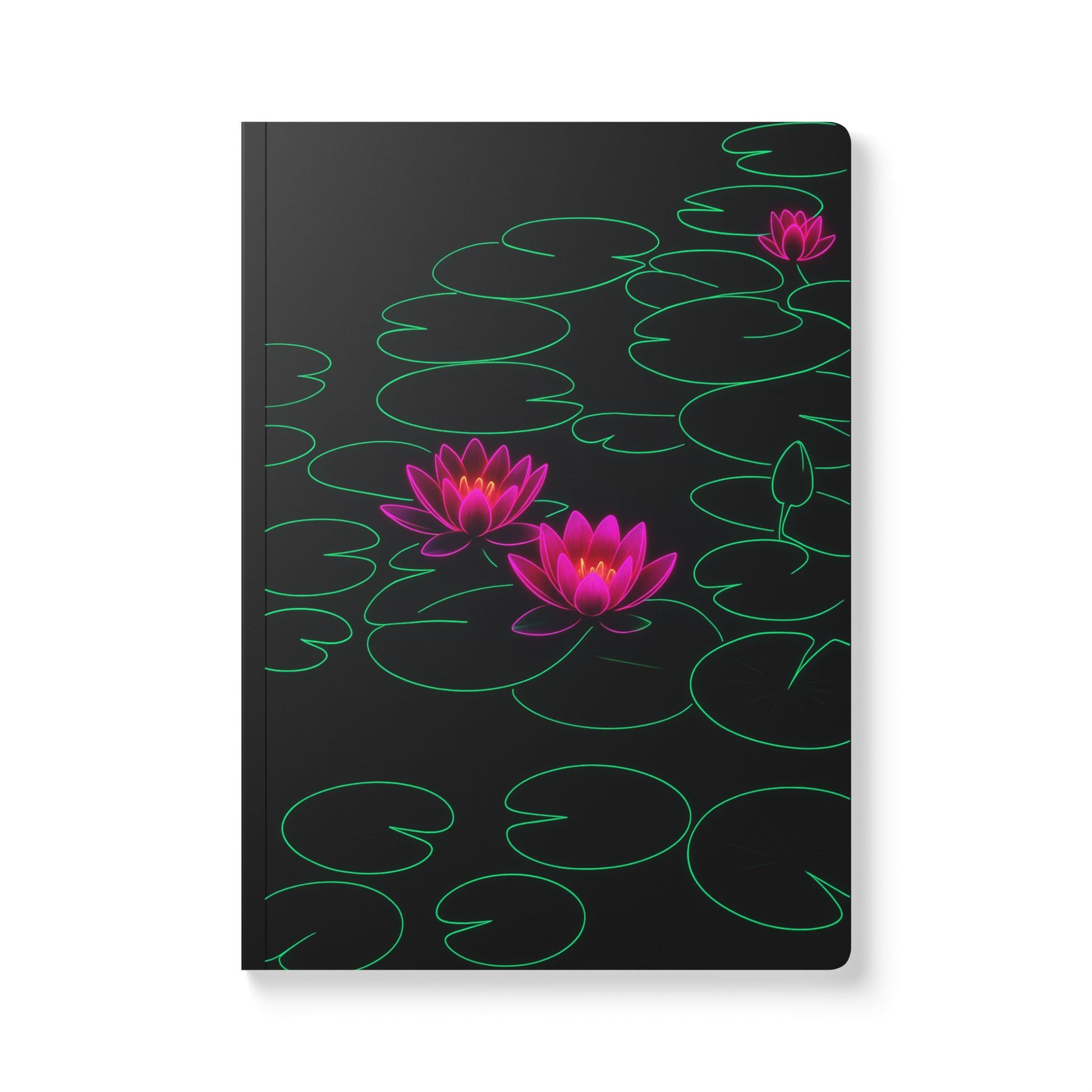 Find your center and let your thoughts bloom with the Neon Lotus Softcover Journal—a serene yet powerful writing space designed for mindfulness, intention-setting, and creative flow. This calming aesthetic features glowing magenta lotus flowers floating atop luminous green lily pads, all set against a sleek black background. Equal parts peaceful and powerful, this design channels focus and clarity with every glance.